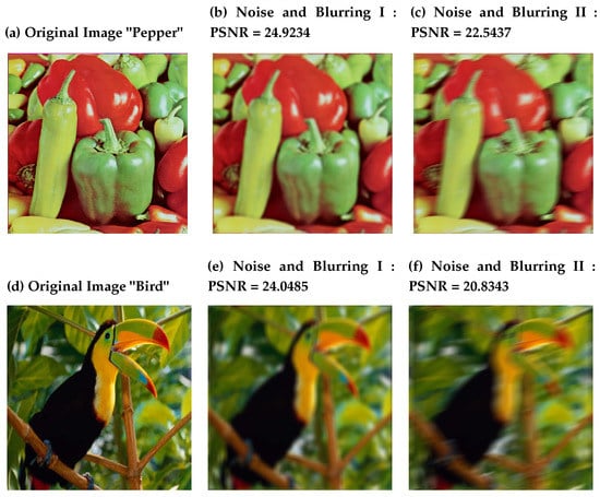 We will use two test photos (Pepper and Bird, with sizes of and , respectively) to exhibit two scenarios of blurring processes in Table 4 and add a random Gaussian white noise , with the original and blurred images shown in Figure 3.