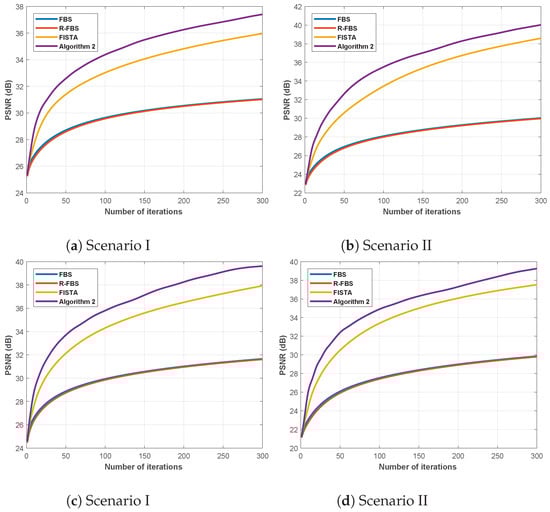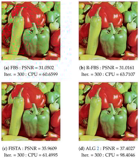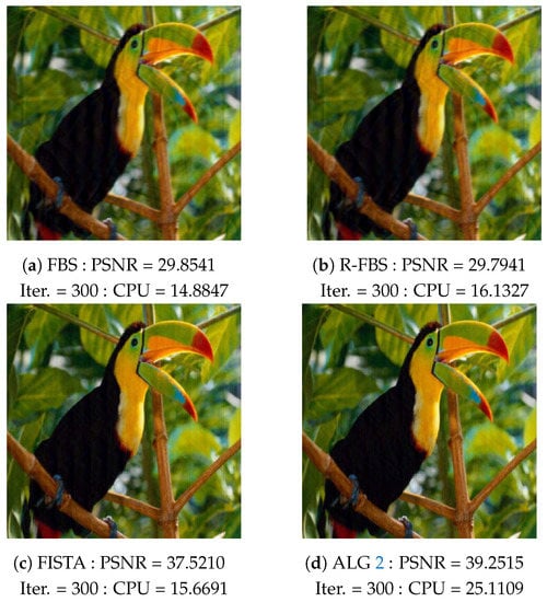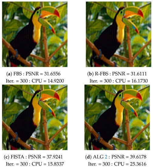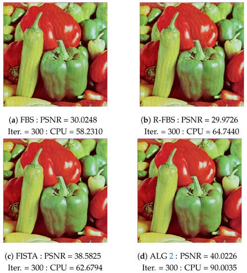 We examine and compare the efficiency of our algorithms (Algorithm 2 := ALG 2) to that of FBS, R-FBS and FISTA algorithms. The image restoration performance of the examined methods is next tested by setting as described in (25) and using blurred images as starting points. For all algorithms, the maximum number of iterations is set at 300. The regularization parameter in the LASSO model (24) is set to . The following are the parameters for the studied algorithms under consideration:
