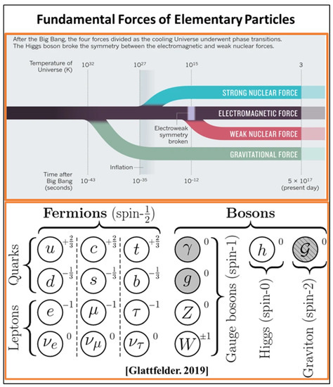 The Higgs particle (h), a scalar spin-0 boson, is associated with the phenomena of mass. The graviton (G) is the hypothetical quantum particle associated with gravity (up-to-date, has not been detected). The elementary particles represented by gray circles are massless, and each particle comes with an electric charge, given by the number associated with it on the upper right side. Adopted from [40] with alterations.