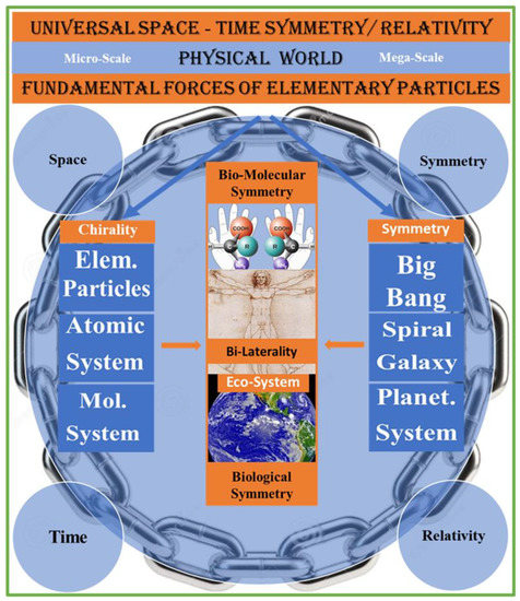 The predictable consequence of symmetry violation at the level of elementary particles is breaking thermodynamic equilibrium between pairs of molecular enantiomers leading to selective bio-chirality. Commonly discussed links between space STS symmetry and biochirality require additional theoretical clarifications associated with experimental verifications within concepts of indivisible and undistinguishable particles. The most trackable connection between STS in physics and biology occurs through space inversion symmetry. Consequently, we will narrow our consideration to P-symmetry in physics which is strongly linked to bio-molecular chirality [117,118,119,120]. Among many aspects of spatial symmetry, chirality gradually gained sharp attention. As mentioned, chirality is one of the most common space-related (geometrical) characteristic of natural objects appearing in our universe at many levels of space size, from the EPs world to the galaxy world. The idea that the non-interrupting chain of chirality transfer comprises of distinct links between overlapping domains of spatial dimension has a long period of clarification. However, even now, we have lack or limited information regarding many links in this chain. In the history of science, we can see the corresponding continuity in the chain of logical conclusions. Ancient philosophers beginning with Democritus considered hypothetical atoms’ shape (i.e., symmetry) determinants of material world diversity. Later, the intuitive symmetry consideration was used by Mendeleev for establishing periodic tables of elements. The symmetry arguments in physics and chemistry were traditionally used to find the solution to puzzles of symmetry transfer from atoms to molecules [118,121,122]. Consequently, molecular chirality was found to be a determining factor in the external and internal symmetry of non-organic crystals and biological macromolecules [123]. From a different perspective, an increasing line of convincing evidence suggests that stereo-specific chemical evolution may originate before the origin of terrestrial life from the contribution of the symmetry patterns of the macroscale galaxy dynamics [124,125]. Essentially, we have a bidirectional chain of chirality transfer across the space scale (see Figure 2) as a causal factor of biochirality.