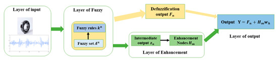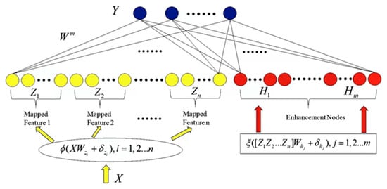 As shown in Figure 1, the BLS is built on the basis of a random vector function chain neural network, but the BLS enhancement nodes are built in a different way from it. Instead of using the raw data as an input layer, the BLS first performs feature extraction on the original data to form the mapping features and store them in feature nodes. The mapping features are then used as the input of the enhancement nodes to perform further transformations. Finally, the defuzzification outputs of the feature nodes are augmented with the enhancement nodes’ outputs to obtain the outputs of the BLS; the connection weights can be quickly calculated by a pseudoinverse.