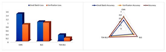 Figure 7 shows the comparison of the small batch loss rate as well as the validation loss rate of the CNN, BLS and TSK-BLS models, demonstrating the comparison of the small batch accuracy, validation accuracy and experimental accuracy. The results from the pictures show that the TSK-BLS has a smaller small batch loss and verification loss, a higher small batch accuracy and verification accuracy, and that its fault diagnosis accuracy is as high as 0.9967 compared to the CNN and BLS. The experimental results show that the TSK-BLS has a higher accuracy. The results from the pictures show that the TSK-BLS has a smaller small batch loss and verification loss, a higher small batch accuracy and verification accuracy, and that its fault diagnosis accuracy is as high as 0.9967 compared to the CNN and BLS. The experimental results show that the TSK-BLS has a higher accuracy than the compared models, which indicates its significant advantages.