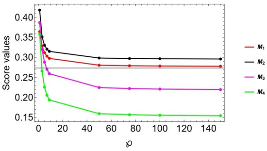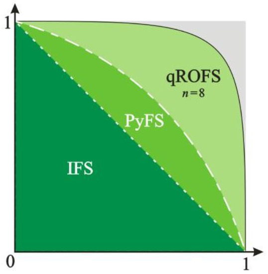 The multi-criteria decision-making (MCDM) process is a skilled approach to handling complex and challenging inputs in realistic situations. MCDM is a process that generates rankings for available alternatives that correspond to the option’s distinct characteristic objects and is a critical component of decision-making sciences [1,2,3,4,5]. In real-world decision-making settings, it is vital to carry the characteristic object (well and precisely). Owing to the complexity and inability of decision-making situations, carrying the distinctive objects of options demands more than precise objects. Zadeh [6] presented a theory of fuzzy sets (FS) to achieve this, in which only the truth grade is confined to the unit interval. The FS theory has attracted extensive attention from notable experts and has been utilized in numerous scenarios in several sectors [7,8,9,10,11,12,13]. However, the FS doctrine has failed to function exactly in multiple instances. For example, it is hard to apply FS to details given in terms of truthfulness () and falsity () ratings. To solve these challenges, Atanassov [14] dispatched the theory of intuitionistic FS (IFS), a redesigned description of the FS that permits the effective handling of inconvenient and unreliable information. IFS includes grades and with the condition . In contrast to an FS, an IFS examines both the amount of satisfaction and dissatisfaction in terms of membership and non-membership grades. Yager [15] recognized the limitations of IFSs; thus, he created the notion of Pythagorean FS (PyFS) by altering the IFS limitations with the rule . This new constraint states that the total squares of the membership and non-membership grades must be inside the unit interval, which widens the codomain. Likewise, Yager [16] once again recognized the restrictions in the assignments of grades to objects in PyFS; therefore, he introduced the concept of q-rung orthopair FS (q-ROFSs). q-ROFS includes the grades of membership and non-membership with the condition . This set allows decision experts (DEs) to freely assign and by removing limits imposed by earlier set theories. Figure 1 displays the comparison of the IFS, PyFS, and q-ROFS ranges. The greatest area of the plane is covered by the curve of the q-ROFS for ; this area increases when q is increased. Therefore, q-ROFS is regarded as the most credible generalization of FS. Wei et al. [17] devised the generalized Heronian mean operator, geometric Heronian mean operator and the corresponding weighted and hybrid forms under the q-rung orthopair fuzzy background. Shu et al. brought forward research on aggregating q-rung orthopair fuzzy continuous information [18]. Khan et al. [19] dispatched a graphical ranking technique and examined numerous examples with their proposed technique. Recently, J. Ali [20] criticized the existing score function and expanded measurements of alternatives and rankings according to the compromised solution (MARCOS) approach with unknown weight information to the context of q-rung orthopair fuzzy data based on the revised score function.