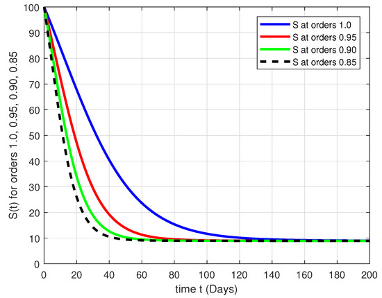 In this part, the numerical results about the fractal-fractional model (1) are provided with the help of our numerical scheme. The basic data were taken from the work given in [34]. We have: , and the fractal fractional orders .