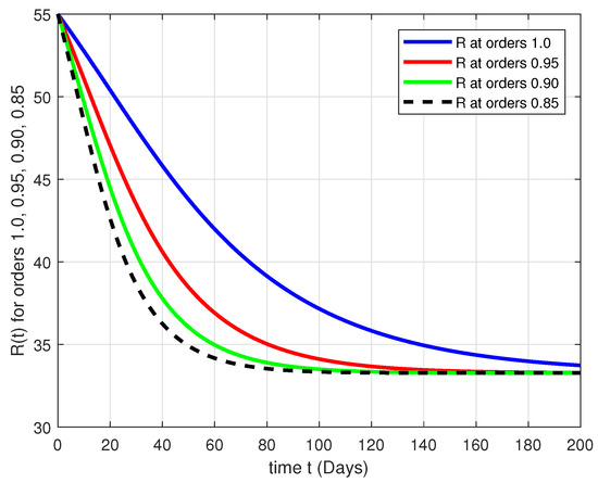 In these figures, we can see the effect of fractal-fractional orders and dimensions on the numerical solutions of the given model. In Figure 1, by increasing the fractal-fractional orders and tending to the integer order, the slope of the graphs decrease, and after 120 days, all of them become stable. In Figure 2, the opposite of this happens. By increasing the fractal-fractional orders and tending to the integer order, the slope of the graphs is positive and it increases, and after 120 days, all of them become stable.