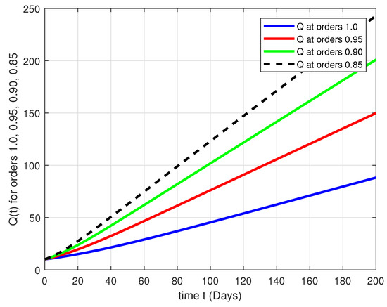 In Figure 3, we see the same behavior in the diagrams as in Figure 1. Finally, Figure 4 depicts an increase in the number of the quitter smokers by increasing the time, and all of the diagrams experience a slight slope by tending to the integer-order.