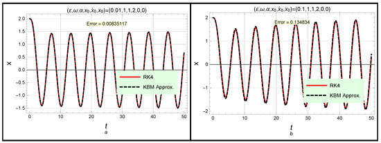 The second-order KBM analytical approximation (9) and the RK4 numerical approximation are numerically analyzed as illustrated in Figure 1, Figure 2 and Figure 3 for different values of the parameters . In addition, the maximum residual error is estimated according to the following relation