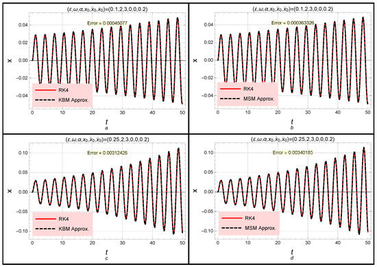 Furthermore, both the second-order KBM analytical approximation (9) and the first-order MSM analytical approximation (20) are compared with the RK4 numerical approximation, as shown in Figure 4a,b for and Figure 4c,d for . It is noted from these figures that there is an almost perfect match between both analytical and numerical solutions, which enhances the accuracy of the solutions obtained. Additionally, it is observed that all the obtained approximations are extremely accurate. Furthermore, the solutions of the forced i.v.p. (3), i.e., , using both the second-order KBM analytical approximation (9) and the first-order MSM analytical approximation (20) with the value of given in Equation (8), are compared with the RK4 numerical approximation, as demonstrated in Figure 5 for . Additionally, the maximum residual error for the second-order KBM analytical approximation (9) and the first-order MSM approximation (20) to the forced i.v.p. (3) are estimated, as shown in Figure 5. It can be seen that the accuracy of the first-order MSM analytical approximation to both the unforced i.v.p. (2) and the forced i.v.p. (3) is better than the second-order KBM analytical approximation. However, both the obtained analytical approximations give satisfactory results and are highly compatible with the RK4 numerical approximations.