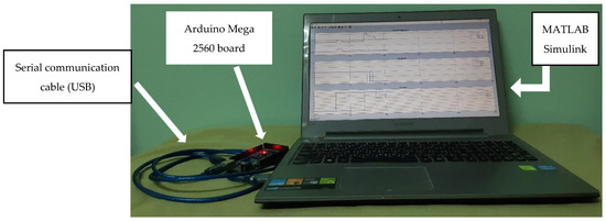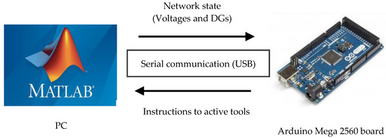 The hardware component in this article is an Arduino Mega 2560 board utilizing an ATmega 2560 microprocessor. It is programmed with the control algorithm intended to govern the network’s overall voltages. Applying MATLAB Simulink, the parameters of both the network and DGs’ are modeled. Power flow analyses are carried out employing the forward/backward sweep method [38]. The forward/backward sweep method is selected in this article for its trustworthiness for radial networks in real-time tests since it converges to an output of reasonable accuracy in a relatively short number of iterations. While Simulink transmits the variables intending to evaluate the state of the network to Arduino, the latter returns the decisions to Simulink. This closed-loop system functions with a suitable sample time. Figure 1 summarizes the cycle of operations of the HIL technique. Figure 2 shows the experimental setup for the latter cycle. The image was taken while the configuration was displaying the live results of the simulation.