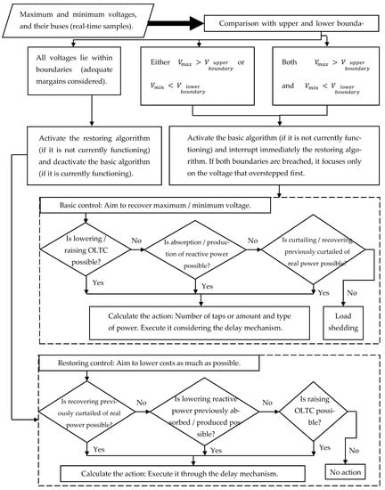 The basic part covers the measures necessary to keep network voltages within prescribed limits in the event that one of the extreme voltages exceeds the allowed limits. The restoring part tends to return both the power components of DGs, as well as the position of the OLTC to their optimal levels, as far as the network state permits. The restoring part functions only when all network voltages are within acceptable boundaries; consequently, the basic part is not functioning. Both parts employ an approximate law [39] to estimate the voltage sensitivities of buses of maximum and minimum voltages to the real and reactive powers of all DGs. It can also give a rough estimation of how much reactive power must be absorbed or how much real power must be curtailed of a particular unit in order to achieve a certain voltage change in a certain bus. It should be highlighted that this algorithm is applicable only to radial networks. The operational principles of the whole algorithm are illustrated in Figure 3.