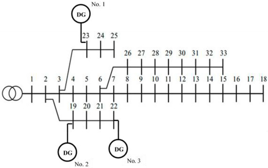 The operation of the algorithm under investigation is tested in the IEEE 33 bus radial distribution network. Data of its loads are tabulated in Appendix A. The standard network is modified by adding three units of DGs, each one having a rated power of 6 MW. The units are located in buses 23, 19, and 22, respectively, as shown in Figure 4. The simulation is based on the assumption of a three-phase symmetric power system, as in practice, significant imbalances do not often take place in medium voltage networks. The tap step voltage of the main transformer is assumed to reach 1.67% of the nominal voltage and a 1 s mechanical activation time for each tap. The voltage of the substation is initially set to 2 taps above 1 p.u. with no intervention from DG units. The lower and upper limits of network voltages are set to be 0.95 and 1.05 p.u. The limits of DGs’ reactive powers are 0.33 * Prated. The delay time is 4 s for the basic part and 6 s for the restoring part.