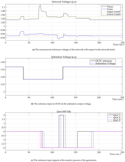 At a time of 70 s, the third unit is activated, and the network maximum voltage oversteps again. Initially, the basic control cannot set a further tap changer operation, as lowering the substation voltage further leads the minimum voltage to drop below the network voltage lower boundary. Thus, the OLTC option is inaccessible at this moment. Hence, reactive power control is selected. The entire reactive power control capacity of all units is employed one after another split by appropriate delays according to the time constants of the generators, such as the delay mechanism states. They are arranged in descending order by the coefficients of voltage sensitivity with respect to the bus of the overstepped voltage. The network maximum voltage continues to be beyond its boundary, even after the reactive power control, which has become currently inaccessible. As a result, real power control is employed. The third unit is picked for its highest sensitivity. Its real power is reduced by an appropriate quantity to maintain all voltages within acceptable limits.