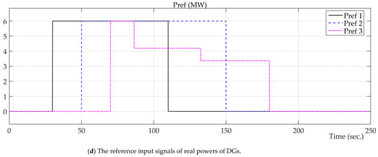 In the simulation test applied, the DGs are connected to the network (with their full capacity) at t = 30, 50, and 70 s, and then detached (modeling the case of non-availability of real power) at t = 110, 150, and 180 s, respectively. The simulation results are illustrated in Figure 5.