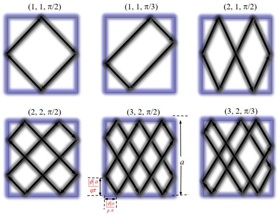 The spatial distributions of quantum wave functions corresponding to classical POs [76,77,78,79] have been an intriguing phenomenon in open ballistic cavities. Semiclassical PO theory has been used to explain the scarred wave functions in chaotic billiards [21,22,23]. Nevertheless, it is pedagogically useful for comprehending the quantum-classical correspondence in mesoscopic physics to fully develop the connection between quantum eigenfunctions and classical POs in integrable systems. One of the simplest integrable billiards is the square billiard [11]. In a square billiard, each family of POs can be specified with three parameters (p, q, and ϕ), where p and q are two positive integers describing the number of reflections with the horizontal and vertical boundaries, and ϕ (−π < ϕ < π) is associated with the wall positions of specular reflection points [11,65]. Alternatively, the parameter ϕ may also be linked to the starting point of the classical particle. Figure 1 depicts some examples for POs in a square billiard. The trajectory can be seen to constitute a single, non-repeated orbit when p and q are co-prime. When p and q have a common factor m, the trajectory is an orbit family that corresponds to m primitive POs with indices of (p/m, q/m, and ϕ/m).