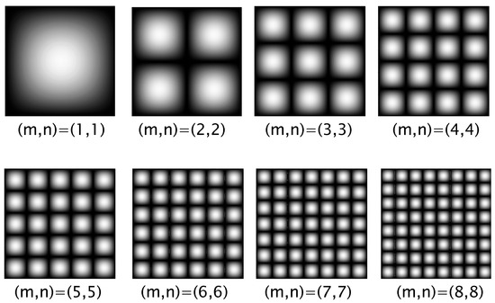 where , , and are the Bessel functions of the first kind with order m. The quantum numbers m and n are the quantization of the azimuthal and radial oscillations, respectively. The eigenvalues for are given using with , where is the nth zero of and a is the billiard diameter. Figure 8 shows the wave patterns for the function with different quantum numbers (m, n). Here, the real part of the eigenfunction is purposely used for revealing the nodal structures in the radial and azimuthal directions associated with the indices n and m, respectively.