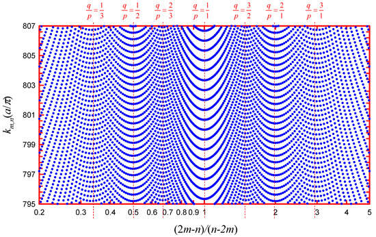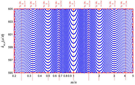 Since both quantum numbers are positive integers, the slope must be a rational number. From Equation (6), the nearly degenerate condition can be generalized as , where p and q are coprime positive integers. Figure 3 depicts the spectrum as a function of the ratio for a square billiard with . The spectrum conspicuously reveals that the eigenvalues are clustered in the vicinity of to form valley structures. Clustering means that levels with very different quantum numbers have very similar energies. From the condition , the central eigenstate for the coherent superposition can be in terms of a single parameter N as or . The slope signifies that the quantum numbers for the nearly degenerate eigenstates around the central mode can be given using and with the integer index K in a small range. Consequently, the coherent superposition of the nearly degenerate eigenstates around the central mode can be generalized as