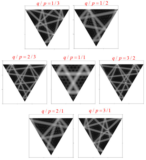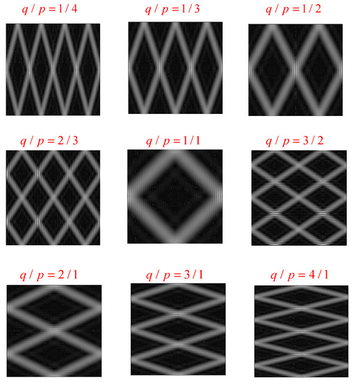 where is the phase factor in the range of and means the total number of the superposed eigenstates. Note that the parameter ϕ corresponds to the starting point of the classical particle shown in Figure 1. Under the circumstance of , the eigen-energies of the superposed eigenstates can be confirmed to be close to a constant energy. Figure 4 illustrates the wave patterns calculated using Equation (7) with N = 100, M = 5, and for eigenstates clustered around the indices (p,q) shown in Figure 3. The wave patterns of are evidently localized on the classical POs. The velocity direction of the trajectory can be straightforwardly determined with the relation of . By way of explanation, the wave function in Equation (7) is not a strictly stationary state since the eigenstate components are not exactly degenerate for the Hamiltonian H. Nevertheless, will rapidly approach to zero as for a small M. Therefore, the coherent state in Equation (7) can be regarded as a quasi-stationary state in the mesoscopic region.