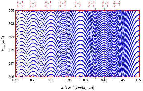 Since the slope needs to be a rational number, the nearly degenerate condition in Equation (14) can be generalized as with p and q being coprime positive integers. Figure 6 depicts the spectrum as a function of the ratio for an equilateral triangle billiard with . The eigenvalues can be seen to be clustered in the vicinity of to display the valley structures. Obviously, the level clustering is certainly accompanied by the emergence of the gap. From the condition , the central eigenstate for the coherent superposition can be given by and with a single parameter N. Combining with from Equation (14), the coherent superposition of nearly degenerate eigenstates around the central mode can be expressed as