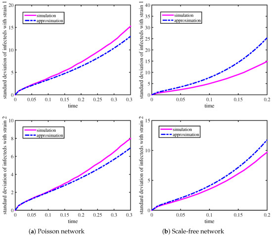 Figure 2 shows the period of time at which we have agreement in the standard deviations of those infected with strain 1 and strain 2 between the two networks with the predicted results. From