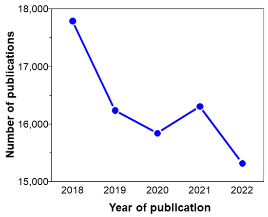 Number of publications resulting from the search of “solar cells” on Web of Science, accessed on 12 September 2023.