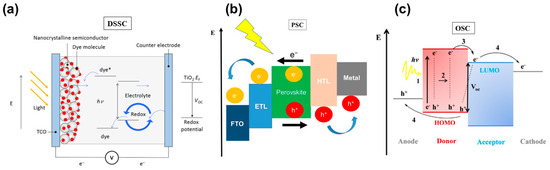 Solar cells are electronic devices for converting the sun’s energy directly into electricity. Generally, a solar cell comprises a semiconductor with a photovoltaic effect once illuminated. In terms of DSSC, the mechanism of the photovoltaic device includes three steps: light adsorption, charge production, and charge transport. Notably, the first process is the light adsorption of the dye molecule to change the excited state (dye*), after which this dye provides electrons for the conduction band of the semiconductor, accompanied by the oxidation process of dye*. Then, the injected electrons will move to the photoanode before transferring to CE through an external circuit, as shown in Figure 2a [58]. In terms of PSC, this device generally includes five parts: FTO (Fluorine-doped Tin Oxide) glass as a conductive substrate, an electron transfer layer (ETL), a hole transfer layer (HTL), a perovskite layer, along with a metal electrode. PSC’s operation may be broken down into three steps: light adsorption and production of excitons, electron-hole separation, and charge transfer process. In particular, the perovskite layer will absorb solar energy to create electrons in the conduction band and holes in the valance band. The electrons then move to ETL before being transported to the anode, whereas the holes flow to HTL before being transferred to the cathode (Figure 2b) [59]. The process includes four steps for OSC’s working principle: light adsorption/electron-hole pairs production, charge diffusion, charge dissociation, and charge transport to the electrodes, as shown in Figure 2c [60]. In particular, when a p-type material absorbed solar energy, electrons will be excited from the highest occupied molecular orbital (HOMO) to the lowest unoccupied molecular orbital (LUMO). Then these electrons will move to the LUMO of the acceptor before transferring into the cathode. Simultaneously, holes will move to the anode of the OSC device. Overall, the power conversion efficiency (η) is linked to three parameters: the open-circuit voltage (Voc), short circuit current density (Jsc), and fill factor (FF) following the formula η = Voc × Jsc × FF × Pinput.