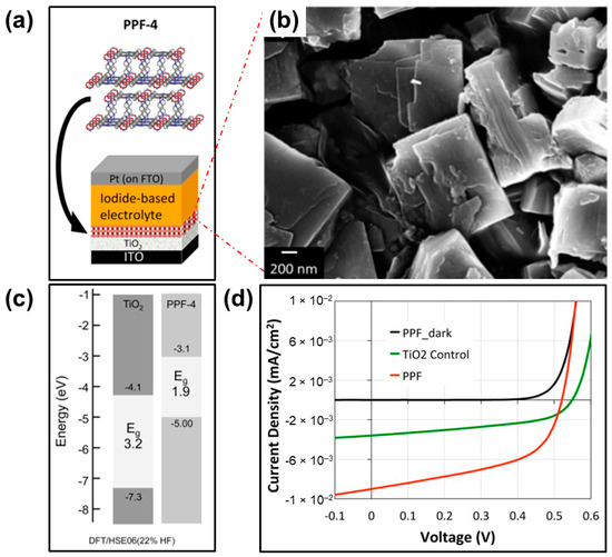 (a) Graphic illustration of PPF-4 and its application in DSSC, (b) SEM image of PPF-4 architecture, (c) the schematic diagram of energy for prediction of band gaps, (d) Current density-voltage plots of various devices under AM 1.5 conditions. Reproduced with permission [62]. Copyright 2017, American Chemical Society.