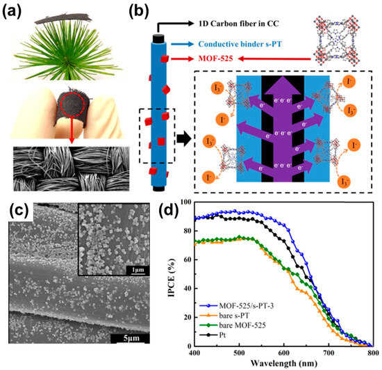(a) Graphic illustration of carbon cloth (CC), (b) graphic illustration of MOF-525/s-PT architecture on CC, (c) FE-SEM image of MOF-525/s-PT-3, (d) Incident PCE plots of various counter electrodes. Reprinted with permission [68]. Copyright 2017, Elsevier B.V.