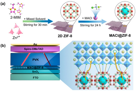 - Jin, Z.; Li, B.; Xu, Y.; Zhu, B.; Ding, G.; Wang, Y.; Yang, J.; Zhang, Q.; Rui, Y. Confinement of MACl guest in 2D ZIF-8 triggers interface and bulk passivation for efficient and UV-stable perovskite solar cells. J. Mater. Chem. C 2023, 11, 6730–6740. [Google Scholar] [CrossRef]