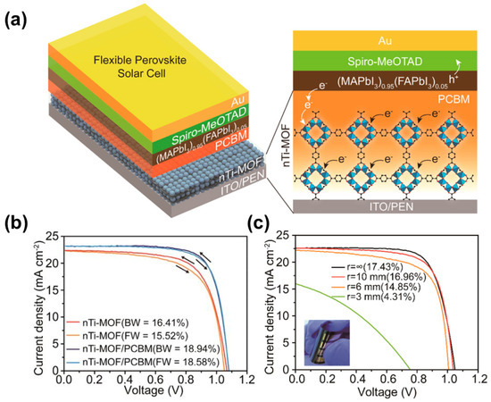 (a) Graphic illustration of PSC device with nTi-MOF/PCBM as an electron transfer layer, (b) Current density-voltage plots of the rigid nTi-MOF/PCBM device, (c) Current density-voltage plots of the flexible nTi-MOF/PCBM device. Reproduced with permission [75]. Copyright 2018, American Chemical Society.