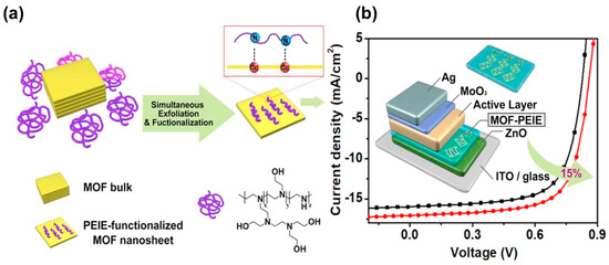 (a) Graphic illustration of the fabrication of MOF nanolayers, (b) The solar cell structure and current density-voltage plots of the device with ZnO (black line) and MOF-PEIE (red line) as EEL. Reprinted with permission [80]. Copyright 2018, Elsevier B.V.