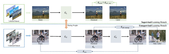 where x and represent synthetic rainy images and corresponding ground truth, respectively, and y refers to real-world rainy images. In the unsupervised branch, the real-world rainy images have no corresponding rain-free images as labels for training. Thus, following the protocol described in [31], we select clean images from synthetic datasets as fake labels to constrain the training of the unsupervised branch.