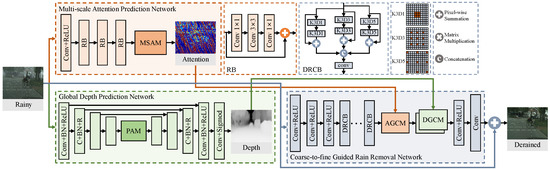The overall architecture of the generator. It consists of three subnetworks for removal of rain from images, i.e., a multiscale attention prediction network (MAPN), global depth prediction network (GDPN), and coarse-to-fine guided rain removal network (CFRN).