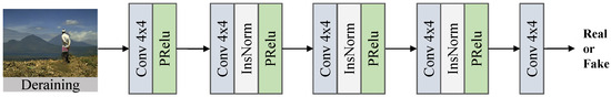 The discriminators [43], namely and , serve to distinguish whether the accepted images are real rain-free images or faked. As illustrated in Figure 4, the discriminator comprises five convolution layers, three instance normalization layers, and four parametric rectified linear units, which guide the generator to generate more realistic rain-free images.