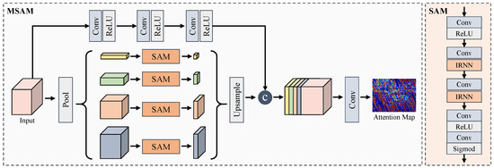 The structure of MSAM. We first apply an average pooling operation to downsample the input into multiscale representations. Then, we use four spatial attention modules (SAM) to generate multiscale attention maps, followed by an upsampling operation to obtain the same size as the input. Another branch leverages the convolution layers and non-linear functions to extract complementary features. We fuse the multiscale attention maps and complementary features through a concatenation layer, and the fused feature representation is fed into a convolution layer to obtain the final attention map. The SAM consists of five convolution layers, two rectified linear units, a sigmoid function, and two identity matrix recurrent neural networks for attention regression.