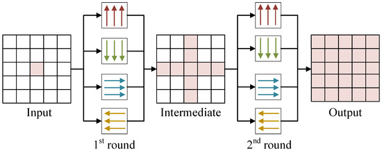 As depicted in Figure 5, we start by adopting an average pooling operation to the input, which downsamples it into four feature maps of different scales. To model rain characteristics across various scales, we incorporate a spatial attention module (SAM) to capture long-range contextual information from the entire feature map. Specifically, we integrate a two-round, four-directional IRNN into our SAM. Figure 6 shows the process of gathering global contextual information using a two-round, four-directional IRNN. Specifically, the first IRNN creates an intermediate feature map that summarizes the spatial contexts along the four principal directions. The second IRNN then produces a global feature map by collecting non-local contextual information. denotes the feature located at pixel , and the IRNN operation to the right (as well as for the other directions) at can be computed as: