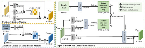 The detailed structures of the position attention module (PAM), attention-guided channel fusion module (AGCM), and depth-guided crisscross fusion module (DGCM).