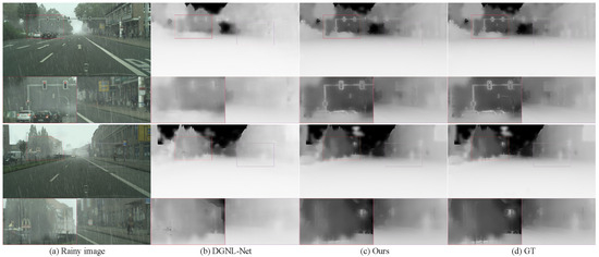 As shown in Table 2, a single rain removal network can only make PSNR and SSIM reach 30.65 dB and 0.910, respectively. After adding the attention map, the PSNR and SSIM scores increase by 0.86 dB and 0.011, respectively. The results of M3 and M4 show that the incorporation of MSAM yields superior results compared to a single SAM, which demonstrates that four multiscale SAMs can further improve performance compared to only one SAM. Adding the AGCM also results in improvements in quantitative measures, which indicates its effectiveness. Furthermore, the PSNR and SSIM scores exhibit considerable improvements after the inclusion of the complete global depth prediction network, which proves that the depth map can provide fine guidance for better rain removal performance. Finally, the overall structure achieves the best performance, which illustrates the effectiveness of DGCM.