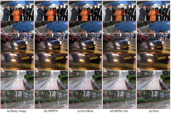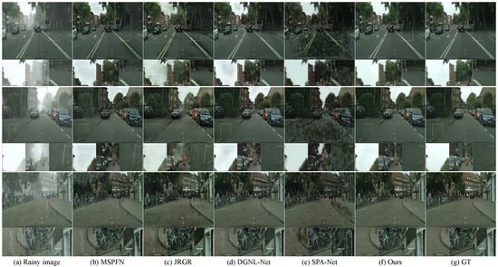 Semi-RainGAN is implemented using the Pytorch framework and trained on an NVIDIA GeForce RTX 3090 GPU. To optimize the model, we utilize the Adam optimizer [48], with a momentum value of 0.9 and weight decay of 0. The learning rates of generators and discriminators are initially set to 5 and 1 , respectively. For the hyperparameters of the loss setting, we empirically set , , , , and to 1.0, 0.5, 0.5, 1.0, and 0.1, respectively. In the experiments, we resize the image patch to 512 × 1024 to train the Semi-RainGAN on the RainCityscapes dataset with a batch size of four. For training on the Rain200L and Rain200H datasets, the image patch size is 256 × 256. Additionally, we resize the images from the Mix200 dataset to match the image sizes of the synthetic datasets.