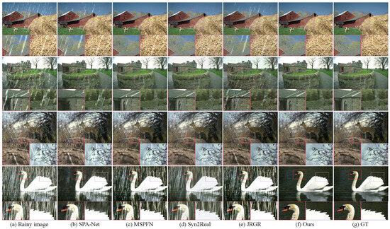 Qualitative results of rain removal from images in the testing sets of the Rain200L and Rain200H datasets. (a) Aainy images. Rain removal results of (b) SPA-Net [8], (c) MSPFN [11], (d) Syn2Real [13], (e) JRGR [14], (f) our method, and (g) the ground truth. Note that the first two rows are from the Rain200L dataset, and the last two rows are from the Rain200H dataset.