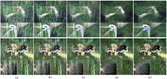 - Zhang, H.; Patel, V.M. Convolutional sparse and low-rank coding-based rain streak removal. In Proceedings of the 2017 IEEE Winter Conference on Applications of Computer Vision (WACV), Santa Rosa, CA, USA, 24–31 March 2017; IEEE: New York, NY, USA, 2017; pp. 1259–1267. [Google Scholar]