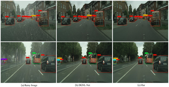 Object detection results on the testing set of the RainCityscapes dataset. Object detection results in (a) rainy images, (b) derained images from DGNL-Net [15], and (c) derained images from Semi-RainGAN.
