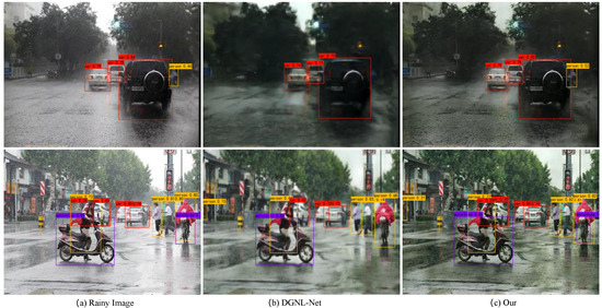 Object detection results on the testing set of the Mix200 dataset. Object detection results in (a) the rainy images, (b) derained images from DGNL-Net [15], and (c) derained images from Semi-RainGAN.