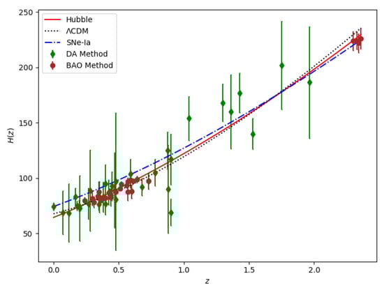 The Hubble parameter is also related to the differential redshift, as , where is obtained from the spectroscopic surveys, and so a measurement of provides the Hubble parameter, which will be independent of the model. In fact, two methods are generally used to measure the Hubble parameter values at a certain redshift, and are extracted from , from the line-of-sight baryonic acoustic oscillation (BAO) datasets and differential age (DA) method [59,60,61,62,63,64,65,66,67,68,69,70,71,72,73,74,75,76,77,78,79], estimating . We notice the observational constraints on parameters , and using the latest 54 data points of in the redshift range , where 28 points are obtained using the DA method, and 26 points are obtained using BAO. The values are presented in Table 1.