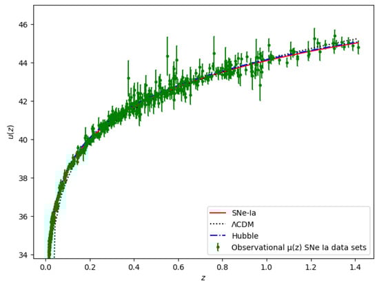 where M is constant for all SNe-Ia. To obtain the best-fit curve, we have to consider the data frame with 580 observed entries of apparent magnitude from the Union 2.1 compilation [80], where . The [80] statistically significant value of M is −19.30.