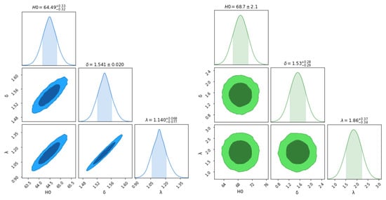 We use error bars for 580 points from the SNe-Ia datasets and compare our model with the well-accepted model for km/s/Mpc, and as shown in Figure 2. We obtain the best-fit plot for approximate values of , , and , with a maximum and an RMSE of 0.2662. Therefore, km/s/Mpc, deviating by from an exact fit. Figure 3 shows the (dark green-shaded) and (light green-shaded) maximum likelihood contours in the -, -, and - planes for the SNe-Ia Datasets.