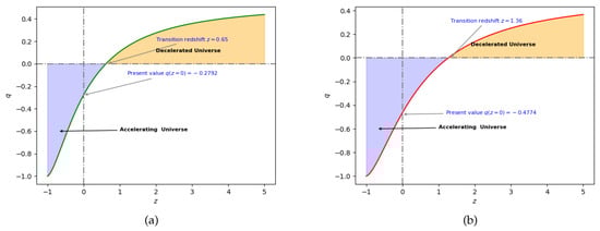 Here, denotes the decelerating phase of the universe, denotes the accelerating phase, represents the transition point where the universe shifts from the deceleration phase to the acceleration phase.