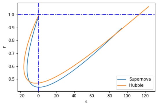 In this study, the argument was made that the plane is useful for distinguishing between various models. An analysis based on has proven useful in differentiating between general relativity and modified theories of gravity. We note that for the Hubble datasets, the r and s parameters at the present epoch (i.e., z = 0) are and , while for the SNe-Ia datasets, they are and , as shown in Figure 5 for the best-fit values of from Table 1. Currently, observations are not sensitive enough to measure these parameters. However, these parameters can be deduced from future observations, which would greatly help to constrain the nature of dark energy.