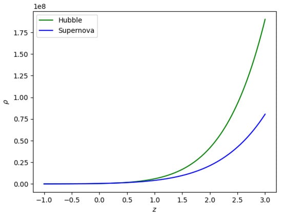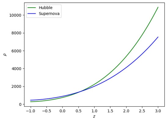 Figure 10 shows the plot of density versus redshift for both Hubble and SNe-Ia datasets, with , , and taken from Table 1, while model parameters = −0.0125 and are −0.012, respectively.