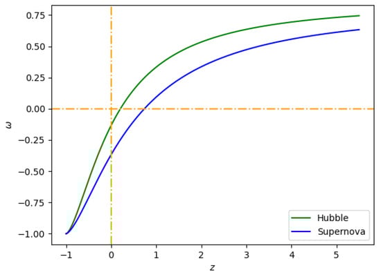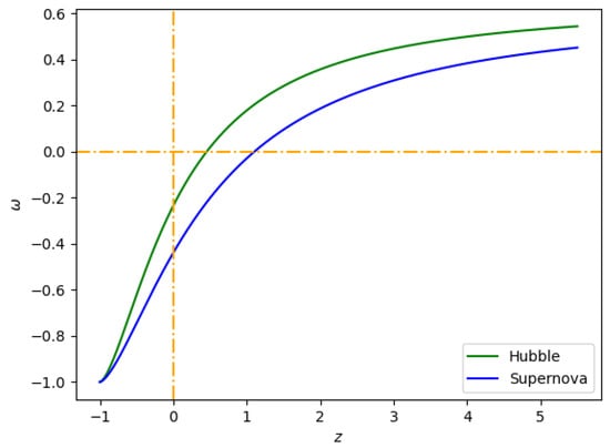 Behavior of the (redshift–EoS) plane for the constant values of , , and , provided in Table 1.