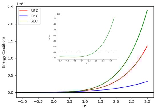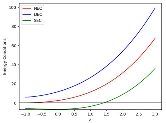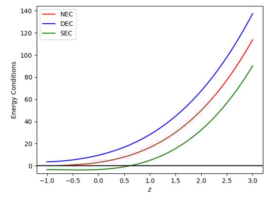 Figure 12 and Figure 13 show plots of energy conditions with respect to constants obtained from the best-fit values of the Hubble and SNe-Ia datasets, as shown in Table 1, and model parameters = −0.0125 and = −0.012. According to the accelerating universe data, as shown in Figure 12 and Figure 13, the SEC must be violated on a cosmological scale [55,56]. Figure 12 and Figure 13 indicate that the NEC and DEC are upheld for both Hubble and SNe-Ia datasets. We examined the NEC behavior (i.e., a partial condition of WEC). Therefore, the concurrent validation of NEC and energy density results in the validation of WEC.
